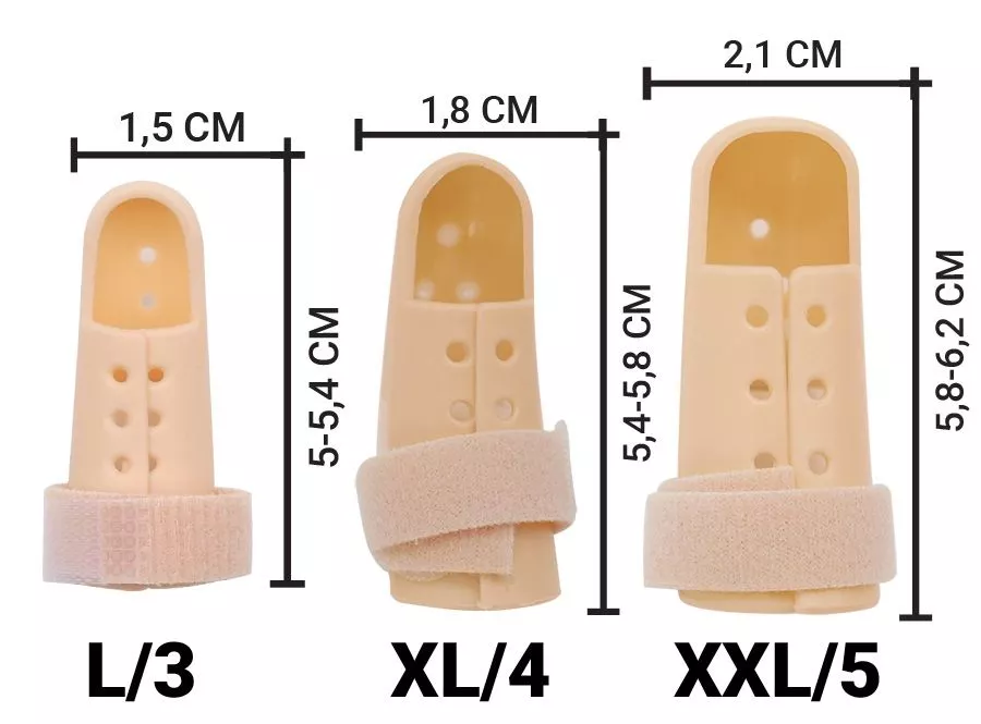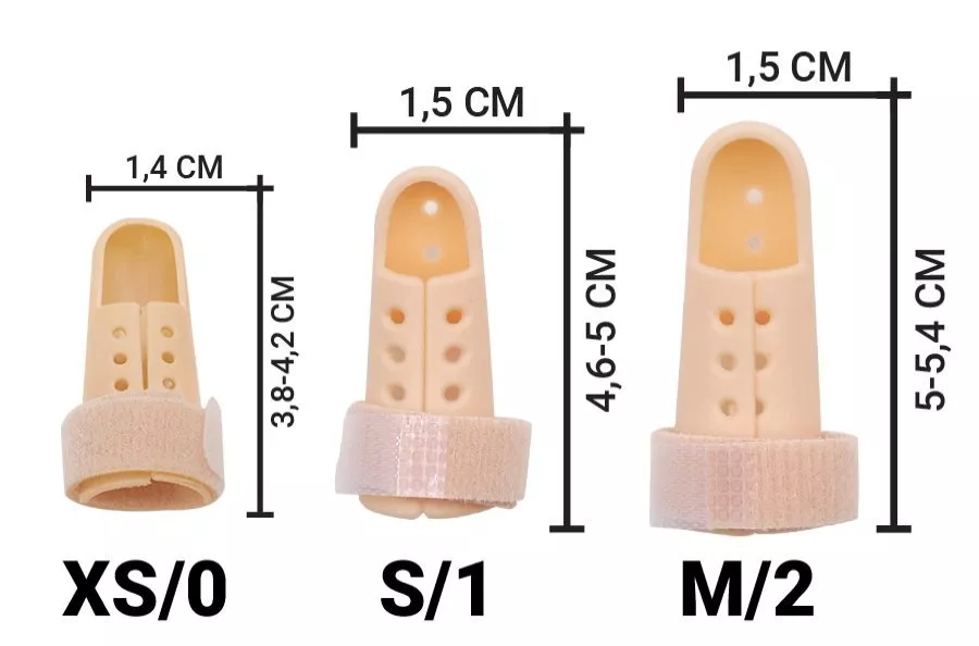 Orteza este disponibilă în mai multe mărimi, de la XS la XXL, permițând o adaptare mai bună la diferite tipuri de degete și mâini. Datorită formei sale compacte, nu interferează cu uzura normală și este ușor de pus și de îndepărtat.
