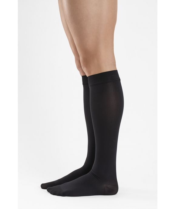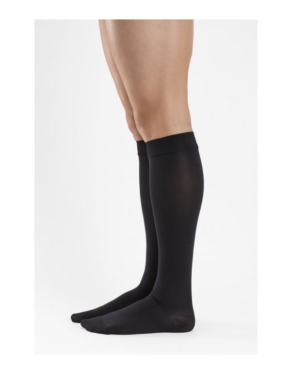 Șosete medicale pentru genunchi cu vârf închis și compresie 15-21 mmHg. Acestea sunt recomandate pentru ameliorarea simptomelor de umflare și greutate la nivelul picioarelor, pentru a trata vene varicoase ușoare și afecțiuni venoase și pentru a preveni embolia și tromboza. Acești șosete cu compresie gradată sunt foarte confortabile, de lungă durată și opace, datorită microfibrelor moi conținute în material. Benzile lor de sus din silicon hipoalergenic împiedică ciorapii să se rostogolească, au călcâiele și degetele de la picioare întărite și cusăturile plate invizibile garantează confort și durabilitate maxime. Înaltă calitate 100% made in Italy.