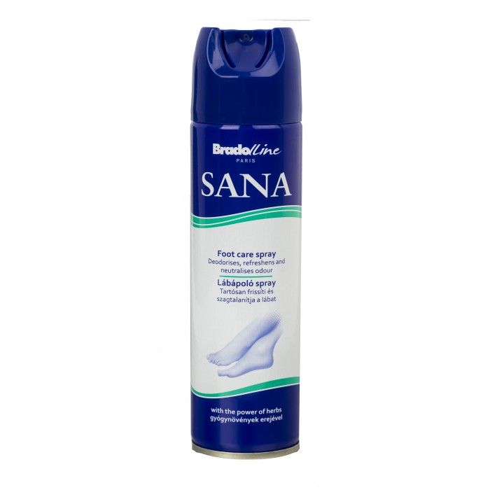 Sprayul de îngrijire a picioarelor Sana împrospătează și dezodorizează piciorul pentru o lungă perioadă de timp. Componentele naturale ale uleiului esential imbunatatesc circulatia sangelui si imbunatatesc efectul materialului dezodorizant. Dezodorizează, împrospătează și neutralizează mirosurile. Cu puterea ierburilor. Spray de îngrijire a picioarelor. Sprayul de îngrijire a picioarelor dezodorizează și menține picioarele proaspete. Componentele volatile naturale ale uleiului îmbunătățesc și revigorează circulația sângelui și măresc efectul componentelor deodorante.